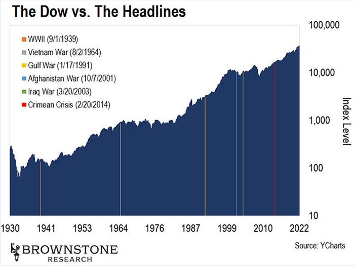 Quería mostrar un gráfico de largo plazo en donde se ve cómo ha evolucionado la bolsa americana en anteriores conflictos bélicos. Cuando estamos dentro parece